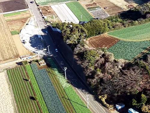 この写真の上方向が三浦縦貫道路の三浦終点なのですが、実は終点とこの道路の接続交差点(丁字路)以来、西側は国道までほぼ一キロ交通整理されていないのです。横断歩道はありません。この界隈は、下の写真、矢印で隠れていますけれど、北側は大きな畑作が行なわれている地域、道路の南側は集落と、ご覧の小規模営農地域です。境目の集落側と思っていただくといいでしょう。つまり、通学の少年少女はもちろん、縦貫道接続で交通量が増えたこの道路に出たり入ったりするのを怖れ、自動車を降りたお年寄りが、日々の暮らしの為に擁壁側を歩くことになっています。