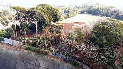 この丘はこうしてせり立っているが為に、丁度風を絞り上げるような感じで、それでなくても冬の西風の折には強い海風が、ここに至ると一層風速を上げ、この木々を揺さぶります。いつ、何が起きても、全くおかしくない状態なのです。