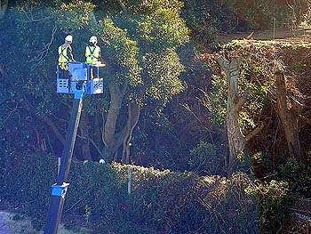擁壁の高さは高いところだと20m以上ありまして、大型の高所作業車でもピンピン一杯の高さです。届かないところは、折れそうな木に登っていっての作業になります。数々の防備策も素人ではとても無理で、割と本格的な工事が必要なことはお分かりいただけるでしょう。