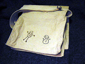 たのしそうな雲さんがロゴを守るフラップの中にはしあわせ家族の肖像。全面によろこび盛り沢山のキャンバスファイルバッグ。
