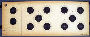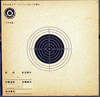 標的交換機を持たない射撃場では、「文銭」的という、幾つかの圏的が印刷されたものを用います。三途の川の渡し賃ということで6個の銭を拓本したものを納棺するところから名称を得ています。写真は日本公式エアライフル10m8号、通称十二文銭の旧型です。左側の縦二個は、試射用の的です。右側に整然と並んだ十個が本射用の的です。これ1枚でシリーズを形成し、1圏的1発の試合なら1枚で1シリーズ、2発の試合なら2シリーズ分です。これは、各シリーズごとに「換的」というブレイクをおいて、射手一斉に交換しに出かけなければなりません。練習の時は号令がないから、居並ぶ皆の中で換的希望者が「立ち尽くして」いる様を呈する迄待つことになります。
