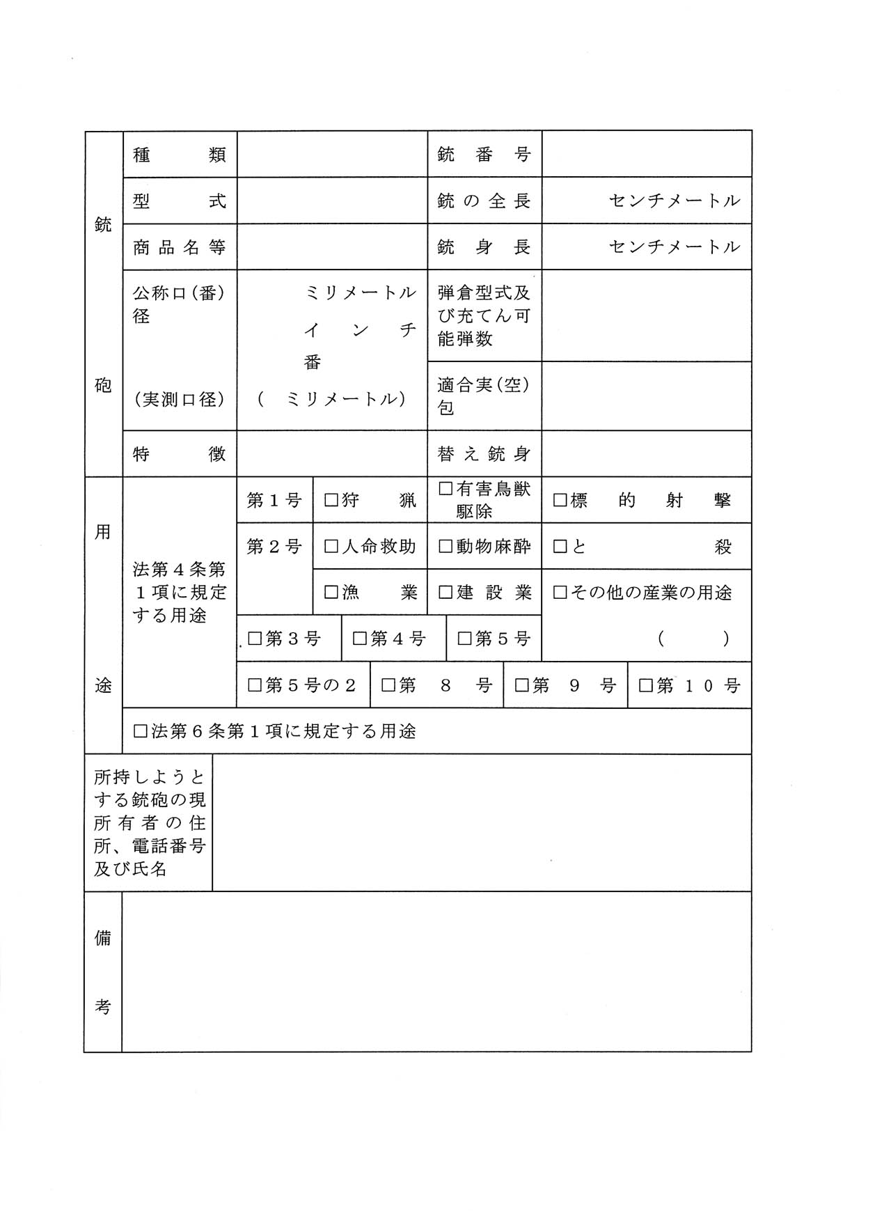 所持許可申請表・裏(両面印刷で使用: JPG): 更新申請(JPG) : 診断書(JPG) : 経歴書 : 同居親族書(JPG) : 誓約書(JPG) : 火薬類譲受許可申請 : 譲渡承諾書 : 経験者講習受講申請 : 教習資格認定申請 : 教習受講申込 : 譲渡・譲受書実包管理台帳(JPEGファイル): ダウンロードしてA4で印刷して使って下さい。